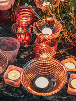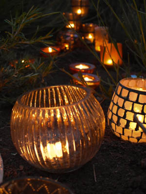 It is vital to consider safety when dealing with fire of any kind. Make sure there is nothing that can catch fire above the holder or that can dangle into the flame. If you are considering hiring large quantities make sure you have organised buckets filled with sand and water near by as a precaution it is best to be safety savvy. I will supply signs to keep people away from open air displays. For large amounts of t lights it is also advisable to put someone in charge as a fire marshal for your event.