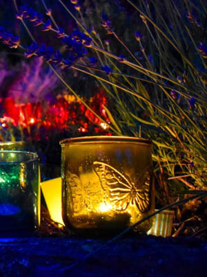 Coloured t light holders can be used to create atmospheric lighting for table centres. They can create fairy groves or light up pathways. They can also create beautiful art features spelling out the initials of the happy couple or can be used to create simple patterns such as stars, hearts or swirls and can really add drama to an event. Often people forget lighting but it is one of the most important things to consider when creating atmosphere. I have hundreds of tea light holders in all sorts of colours one’s that can hang in trees and bushes and ones that don’t.