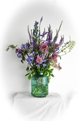 If you want a centre piece for separate tables or to brighten a caterer’s trestle table, posy vases are your answer. They fit a few flowers and can tie a colour scheme together. One can either have them to match the glassware on the table or choose one colour to unify the different glassware on the tables.